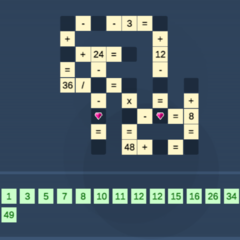 Controls: Players use the mouse to drag and drop to fill in numbers or operations in the blank spaces, or click to select a space and choose a number/operation from the available list.